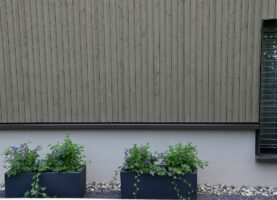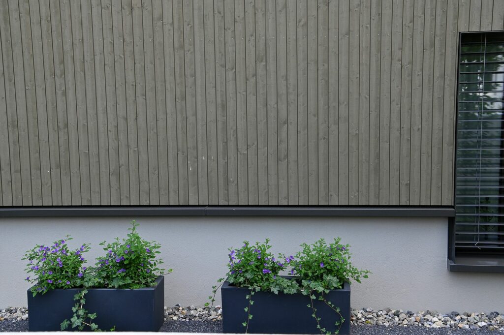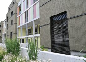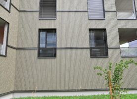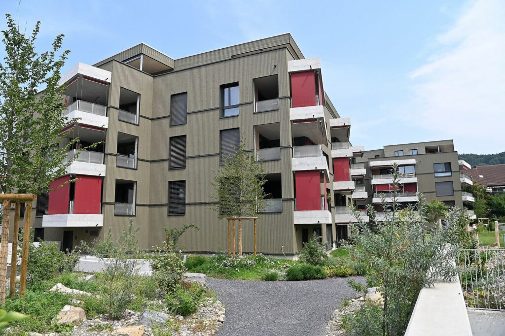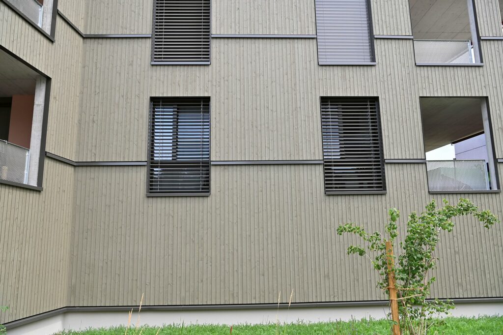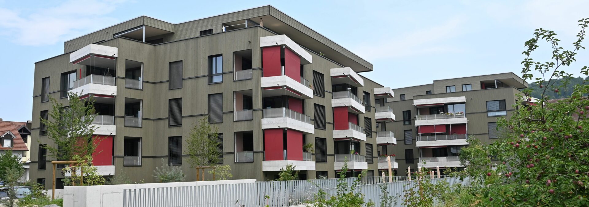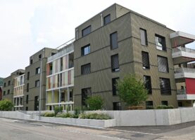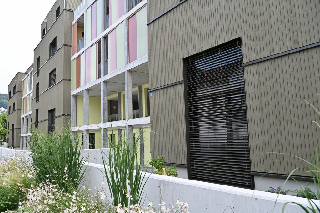 Nordwestseitig verläuft die sehr stark befahrene Staatsstrasse, die spezifische Lärmschutzvorkehrungen erfordert. Hier steht die Bebauung direkt an der Baulinie und tritt als drei Hauptvolumen mit verglasten Balkonen dazwischen in Erscheinung. Sie ordnet sich damit in die Körnung der Bestandesbauten der Unteren Bahnhofstrasse ein.