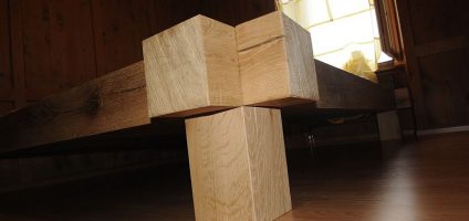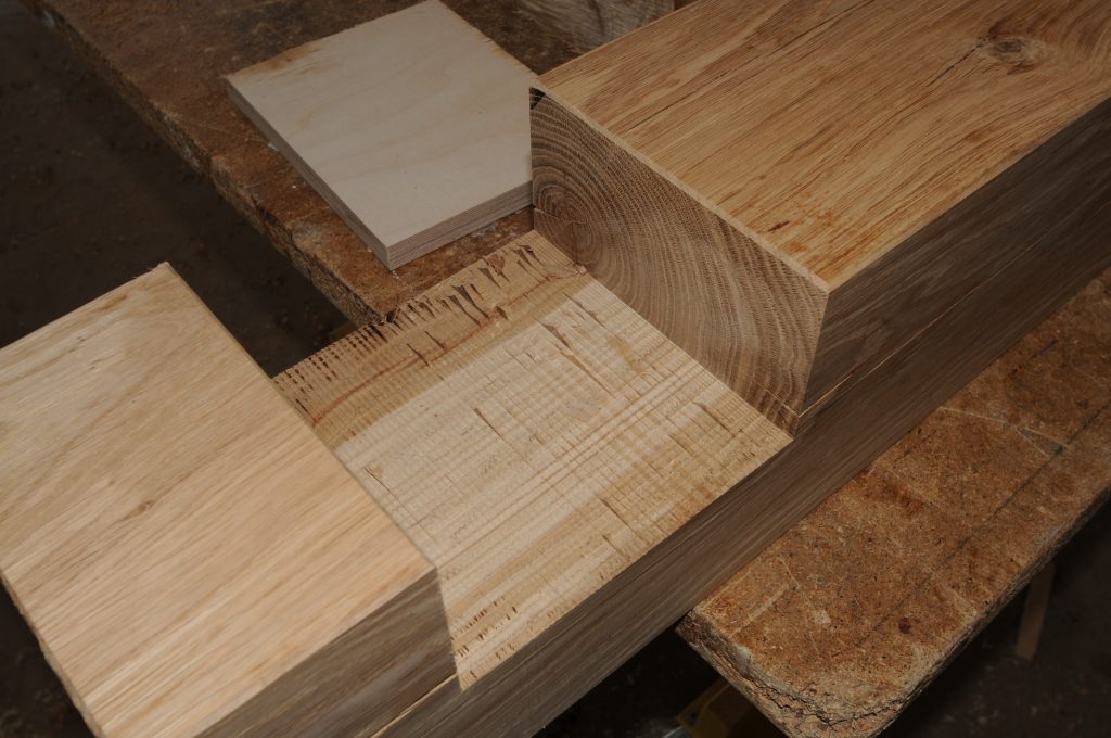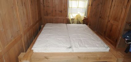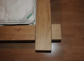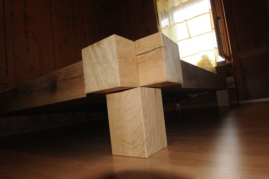 Modernes Eichenbett aus rustikalen Eichenbalken massiv, geschroppt, geölt und ohne jegliche Schraube zusammengesteckt.