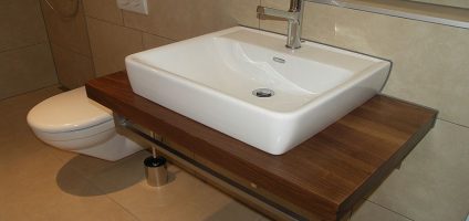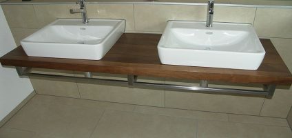 Diese Waschtische mit aufgesetzten Lavabos und Handtuchhalter sind aus europäischem Nussbaum und geben den beiden Badezimmern eine edle Note.