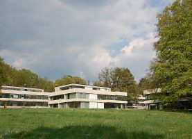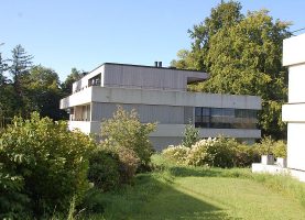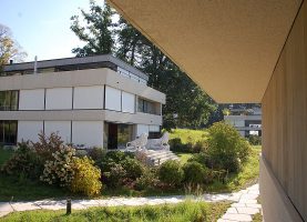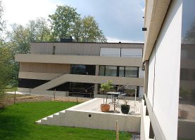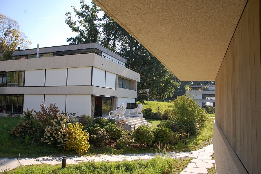 Die Ueberbauung Letzi oberhalb von Küsnacht wurde behutsam in alten Baumbestand eingebettet. Die Materialisierung wurde sorgfältig gewählt. Das Äussere der in Massivbauweise erstellten Gebäude wird zum einen von gestockten Bändern aus Kalksteinbeton im Bereich der Brüstungen und Terrassen, zum anderen von Wandflächen aus Zedernholz bestimmt. Nach Vorstellungen der Architekten sollte sich die Verkleidung mit Zedernholz auch im Innern fortsetzen und zwar umlaufend an den zum Eingangs- und Wohnbereich orientierten Wänden des Schlaftrakts. Zedernholz wirkt schallschluckend und luftreinigend; Ziel der Strategie was darüber hinaus, Innen und Aussen zu verzahnen und die Idee des Wohnens im Park zu verstärken.