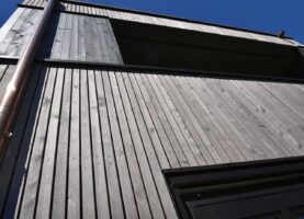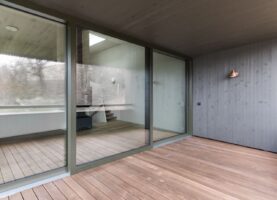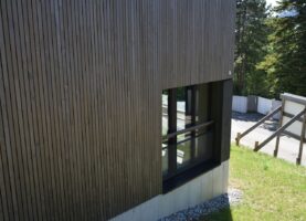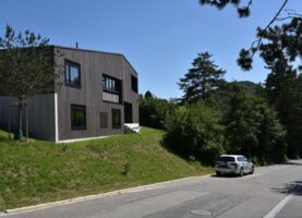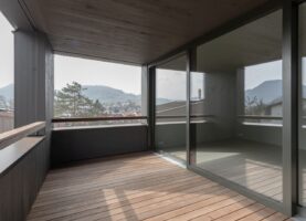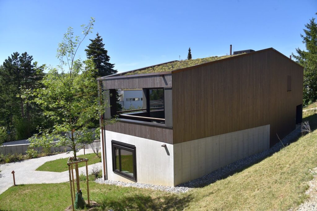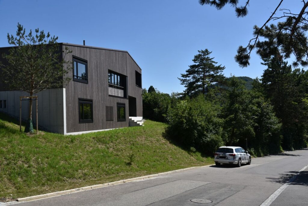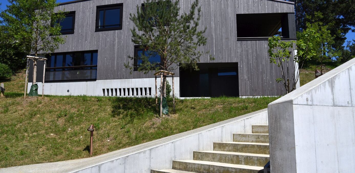 Die sechs Häuser bestehen aus Holz und sind sorgfältig in die Topografie und den wertvollen alten Baumbestand eingefügt. Die Körnung des Ensembles entspricht dem Massstab des Wohnquartiers. Mit dem Prinzip des Splitlevels wird ein kontinuierlicher Raumfluss generiert, welcher die verschiedenen Wohnniveaus miteinander verbindet. Der überhohe Wohnbereich mit Loggia liegt – vom Park abgehoben – auf den oberen Ebenen und bietet einen weiten Ausblick.