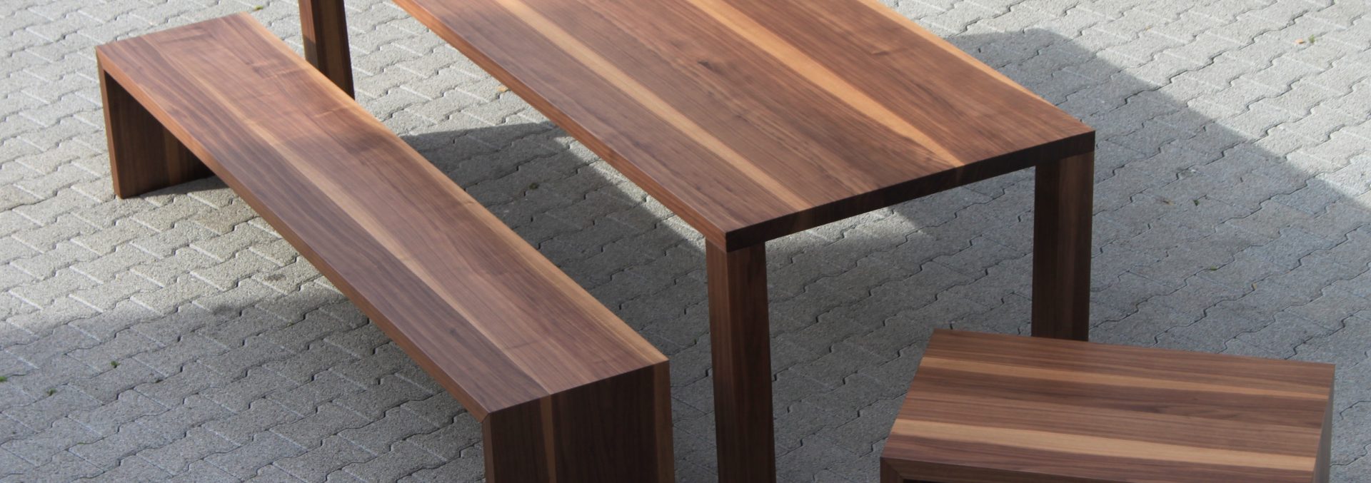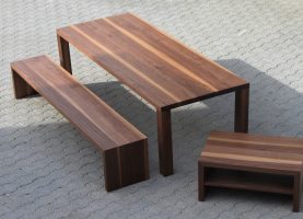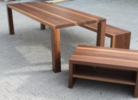 Den Kundenwunsch perfekt umgesetzt: Tisch, Bank und Beistellmöbel, alles aus einem Stamm.