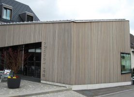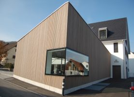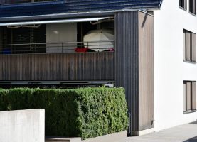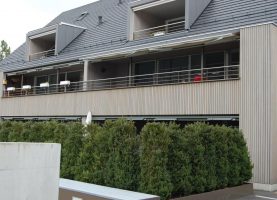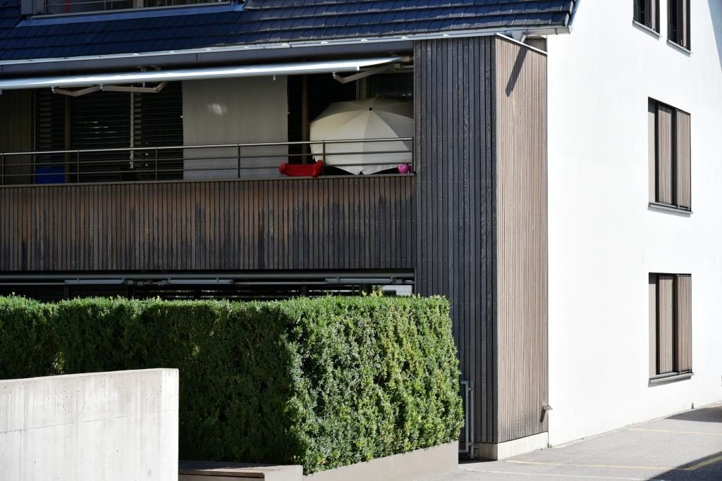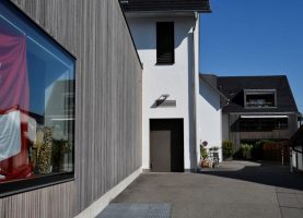 Die Überbauung besteht aus einem Ensemble aus Mietwohnungen und dem Restaurant. Die Holzteile im Aussenbereich wurden in can. Douglas ausgeführt. Das Holz wurde mit einem Vorvergrauungsanstrich versehen. Im Innern wurde für die Tische, Teile der Wände und die Böden Eichenholz in Kombination mit kräftigen Farbtönen verwendet.