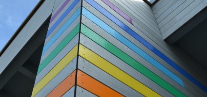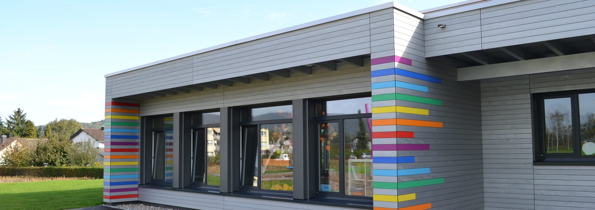 Schön, wenn ein Gebäude – neben Funktionalität und Ästhetik – auf den ersten Blick deutlich macht, für wen es geschaffen wurde und von wem es genutzt wird. Beim Doppelkindergarten Zelgmatt in Killwangen ist dies ohne Zweifel gelungen. Realisiert wurde die komplette Aussenfassade in behandelter Weisstanne. Das Grundeinfärben (Details siehe ganz rechts) erfolgte bei uns in der Firma, die weiteren Anstriche nach der Montage direkt am Bau.