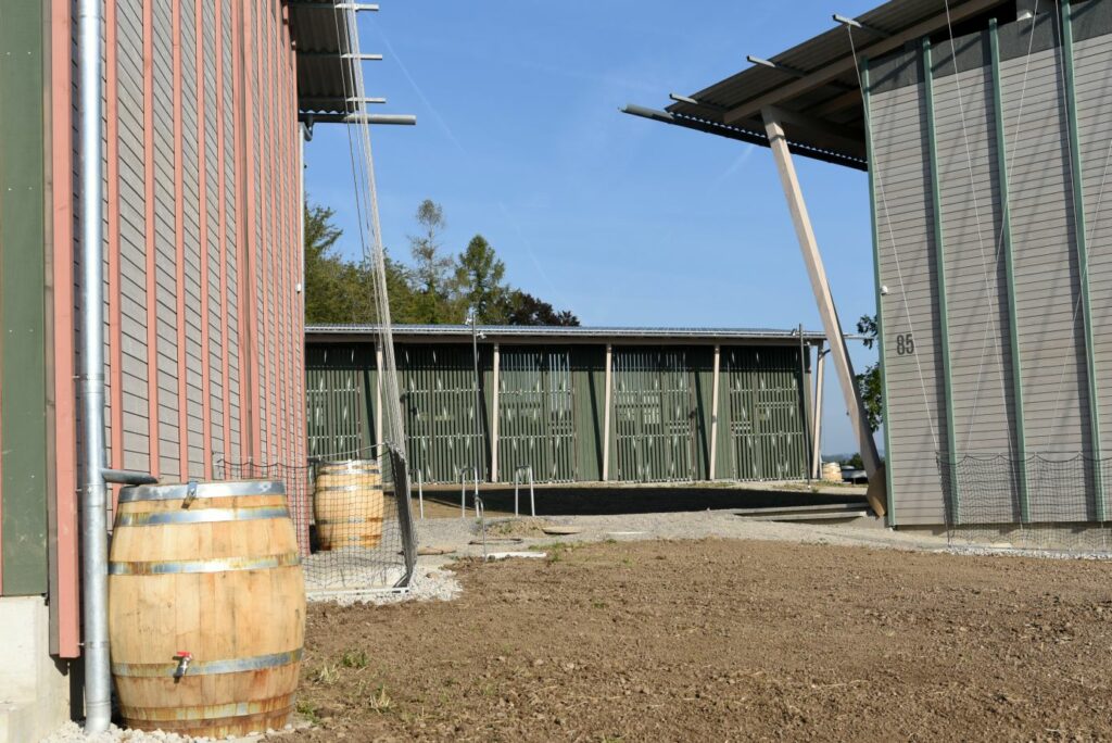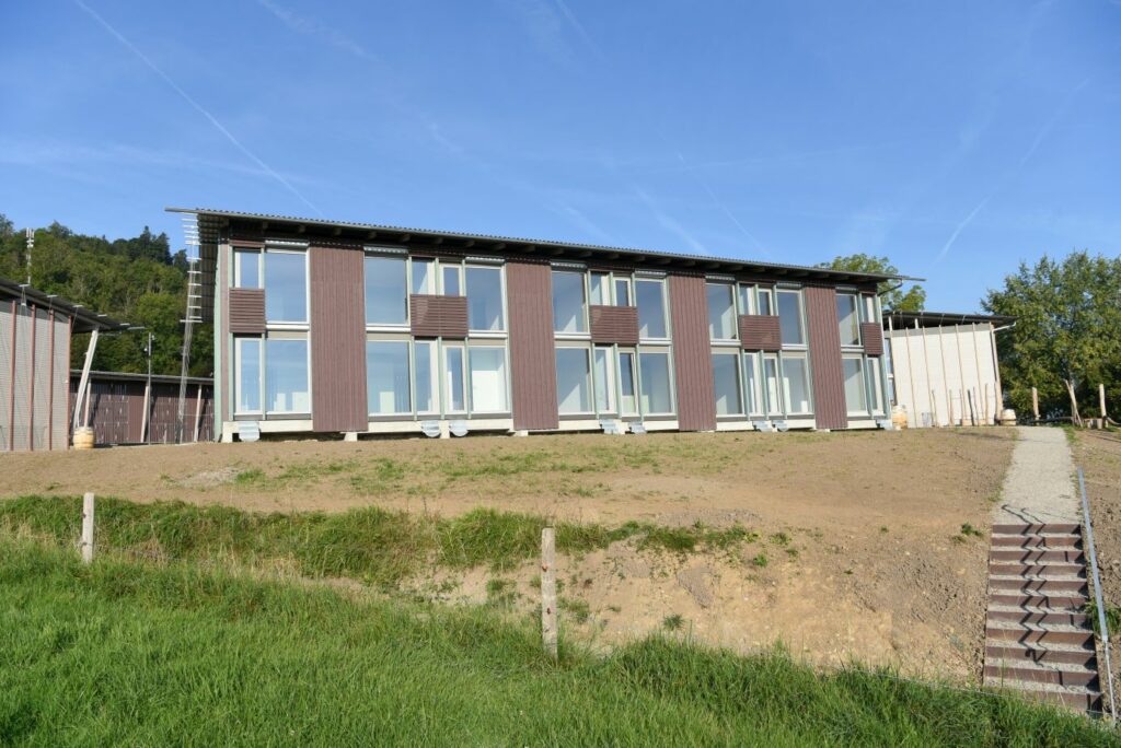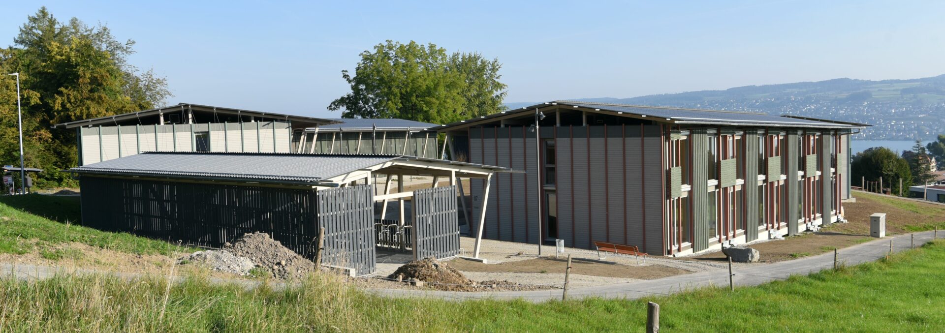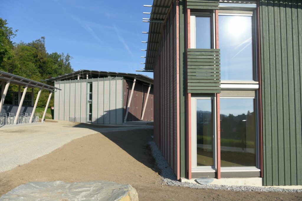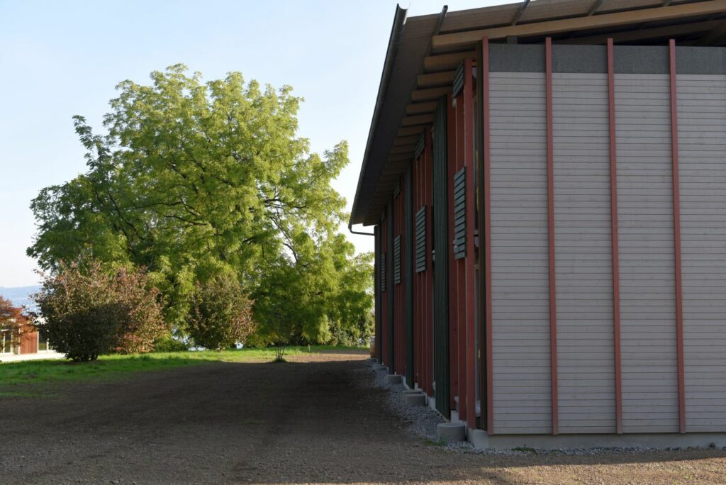 Damit diese Kuppe frei bleiben kann, stehen die Häuser an ihren Rändern. Die fünf Wohnhäuser und das Velohaus sind zerbrechliche, dünnwandige Häuser aus Holz, die hier gleichsam provisorisch aufgestellt worden sind. Vielleicht erinnern sie auch an Zirkuswagen, die zu einer Wagenburg gruppiert sind, und die Zugangswege sind die Reifenspuren der Traktoren. Es erweist sich als gar nicht so einfach, unberührtes, freies Land zu bebauen – daher wohl die Vorsicht dieser Landnahme auf Zeit.
