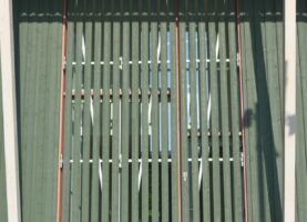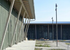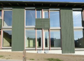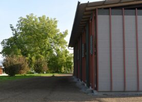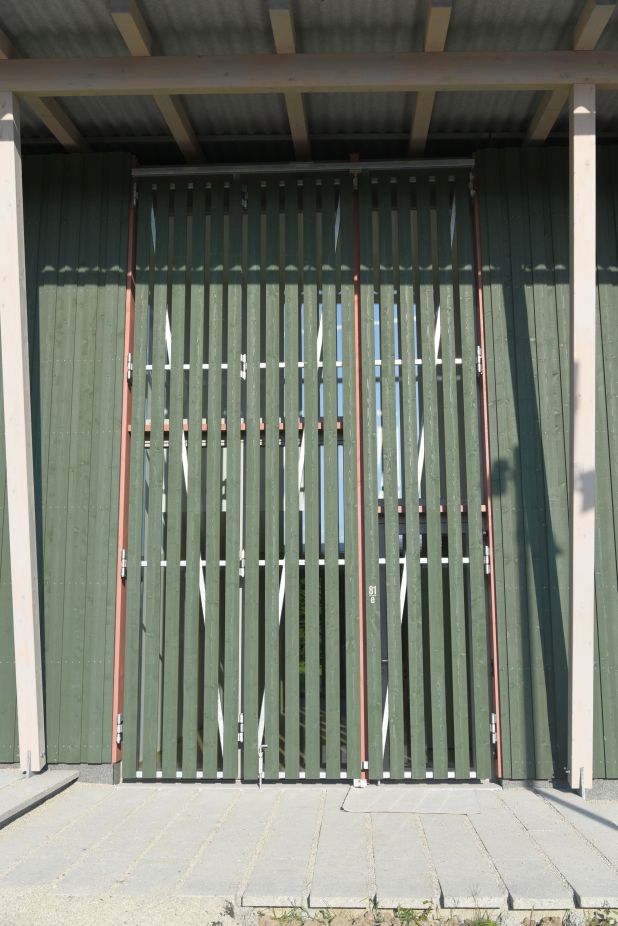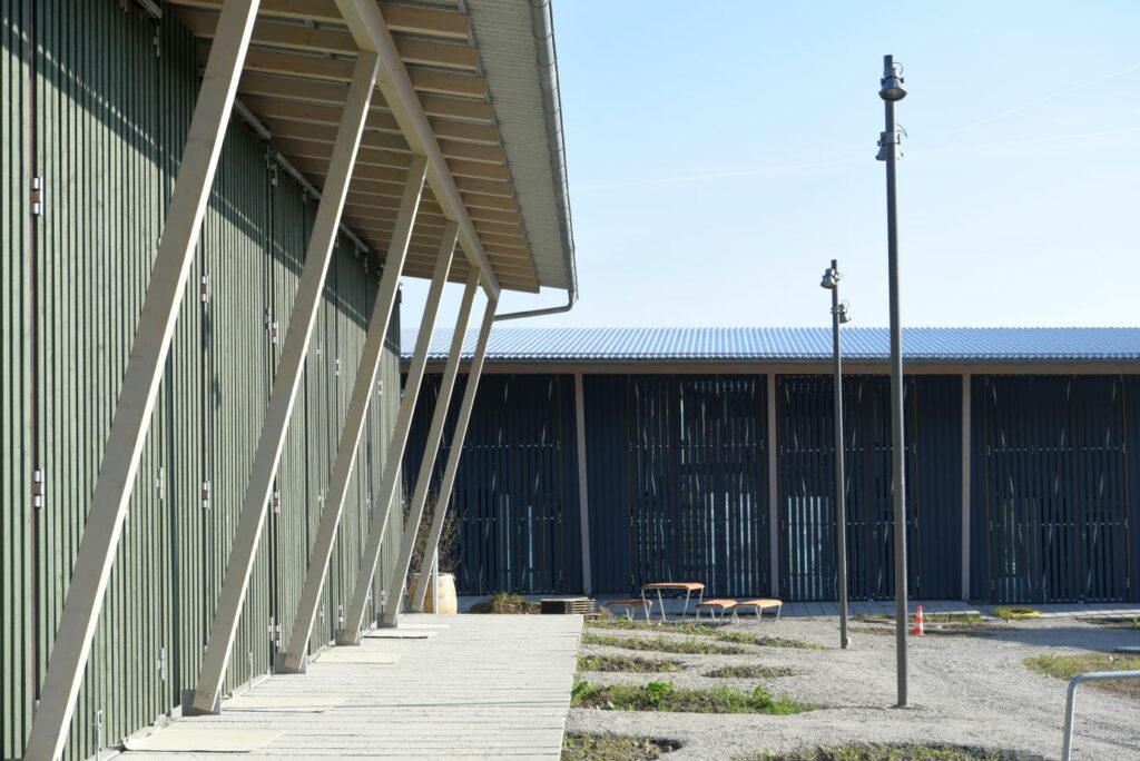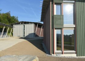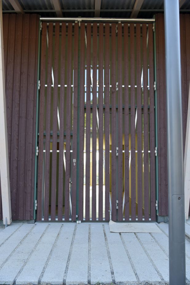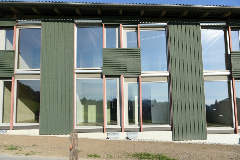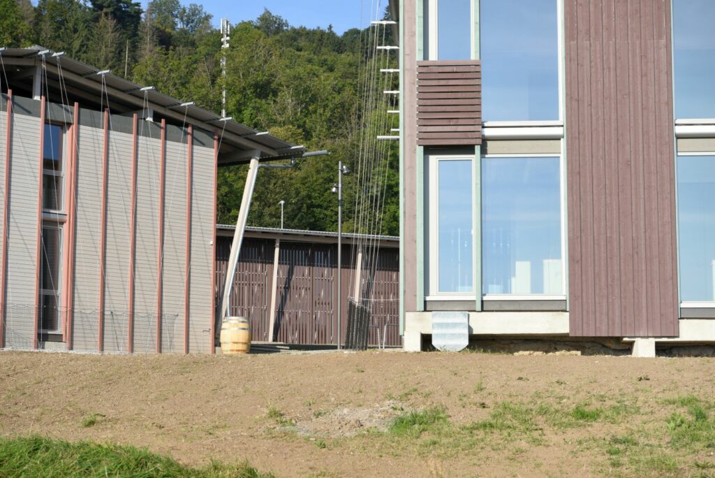 Damit diese Kuppe frei bleiben kann, stehen die Häuser an ihren Rändern. Die fünf Wohnhäuser und das Velohaus sind zerbrechliche, dünnwandige Häuser aus Holz, die hier gleichsam provisorisch aufgestellt worden sind. Vielleicht erinnern sie auch an Zirkuswagen, die zu einer Wagenburg gruppiert sind, und die Zugangswege sind die Reifenspuren der Traktoren. Es erweist sich als gar nicht so einfach, unberührtes, freies Land zu bebauen – daher wohl die Vorsicht dieser Landnahme auf Zeit.