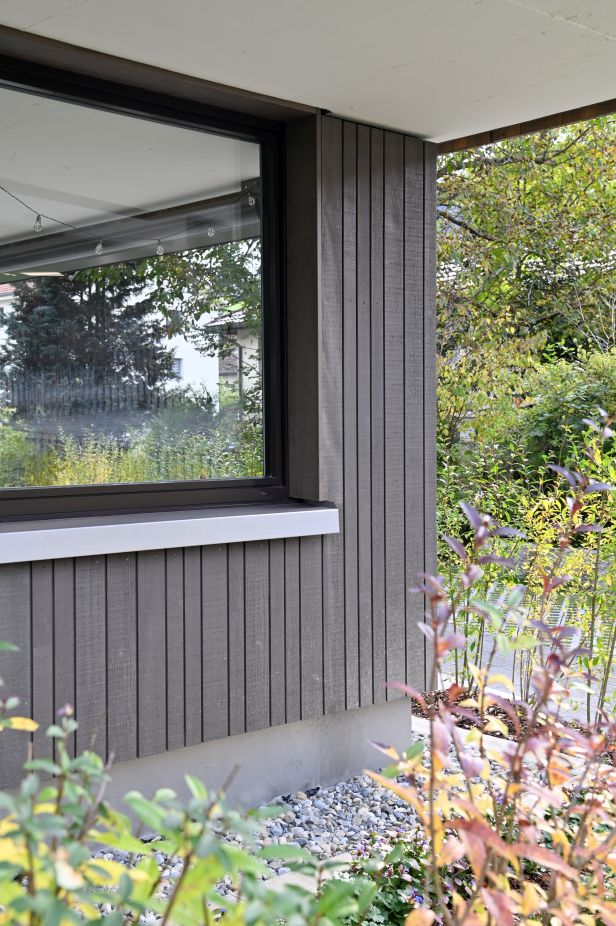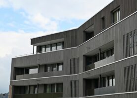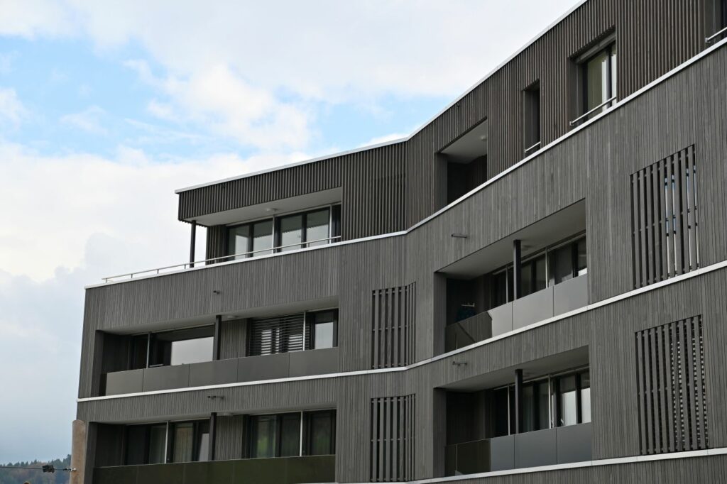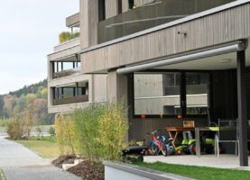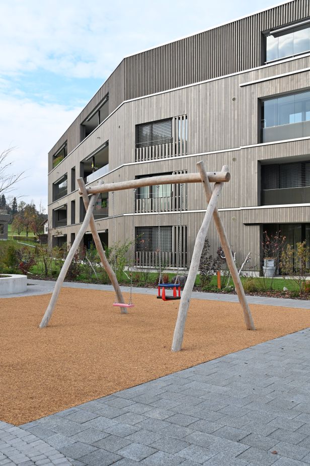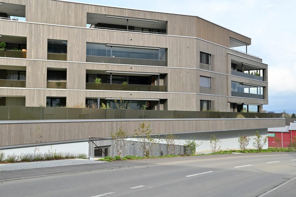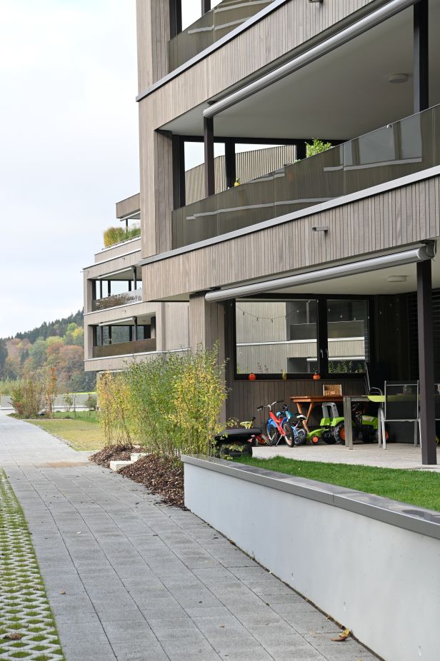 Die drei bogenförmig angeordneten Wohnbauten sind optimal nach Südwesten ausgerichtet. Und bieten auch den Blick auf den sagenhaften Stierenberg. Die schlichte Formensprache lässt die Baukörper kompakt erscheinen. Die grosszügigen Balkone (ab 30 m2) sind in das Gebäude integriert.